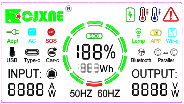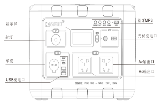 交流输出(2路):共800W(峰值1600W),纯正弦波,220V/110V,50Hz/60Hz。 USB-A(1路):5V⎓2.4A,最大功率12W